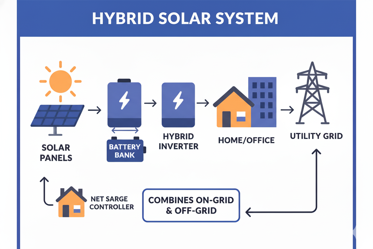 A Hybrid Solar System connects your solar panels to both the utility grid and a battery backup system. It stores excess power in batteries and simultaneously exports surplus energy to the grid under net metering.